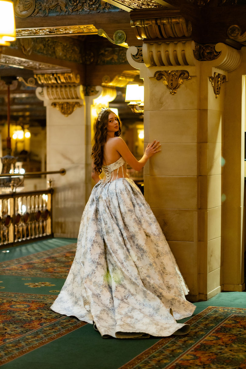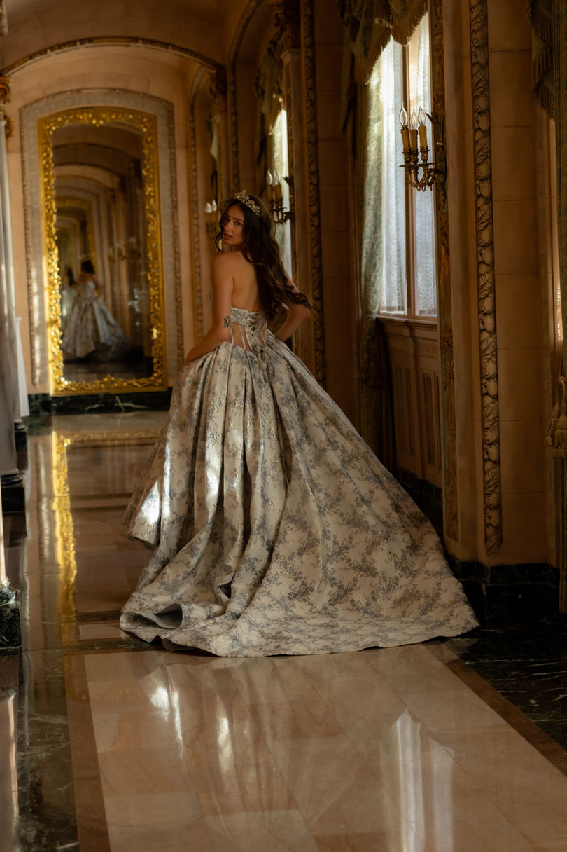 This luxury designer ballgown features beautiful brocade fabric, a lace-up corset back, pewter accents, and pockets! (We love pockets!)